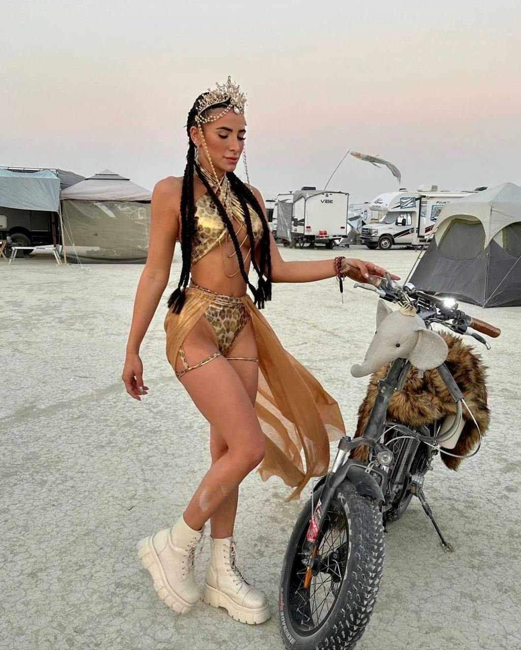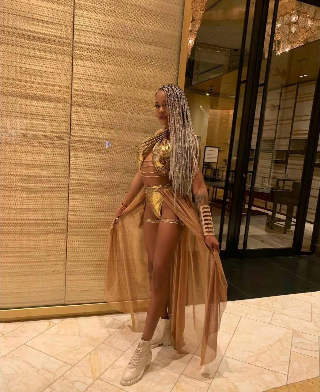 Crafted from the finest spandex and mesh, and adorned with gold-plated brass chains, this ensemble is as durable as it is stunning. For care, hand wash and dry clean only, to preserve the majesty of your attire.